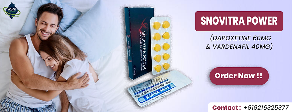 Snovitra Power is a pill combination that includes two active components: Dapoxetine 60mg and Vardenafil 40mg. Dapoxetine, as an SSRI (Selective Serotonin Reuptake Inhibitor), which plays the key role of delaying ejaculation, is the first choice to treat premature ejaculation. Vardenafil, an active principle belonging to the class of PDE5 inhibitors, increases blood flow to the genital area, making erection easier to get and maintain. The combination of these two properties is what gives Snovitra Power an additional advantage over the other pills, as it provides a holistic solution not only for men who have acquired ED but also for those who see PE as their companion.